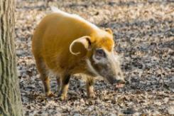 The red river hog (Potamochoerus porcus) is the most strikingly colored of all the world’s pigs. It is a wild member of the pig family living in the rain forest belt of West Africa. The red river hog is offered as a trophy in Cameroon, CAR and Congo-Brazzaville. It inhabits rain forests and lives in areas with rivers or swamps. Red river hogs are closely related to bushpigs, but average lesser weights. It is not believed that the two species interbreed where their ranges overlap. Adult hogs weigh 100 to 255 pounds and stand 22 to 31 inches tall. Look for its striking red fur when hunting red river hogs in Africa. The boar is larger than the sow, and has lumps on both sides of its snout. The red river hog’s tusks are much smaller than a warthog’s tusks, and are hard to see.