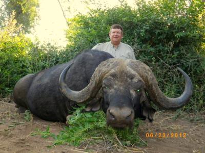 The .375 H&H is the minimum caliber that is allowed for buffalo hunting. A better choice is the .416 or larger. Proper caliber and double vs. bolt has been and will continue to be the source of many campfire debates. One thing you can be sure of. When “black death” erupts from the nearby bush and is headed your way, you will want the largest caliber that you can comfortably shoot. Many buffalo hunts have ended with the buffalo dropping immediately in front of you, almost within reach. You cannot have too much stopping power in this circumstance! Whether your rifle has a scope or not should be dictated by the density of the terrain that most of your hunt will occur in. Ask your PH for his recommendation on whether to use a scope or not. Most will advise using the scope, as there is nothing like a well-placed lethal first shot when buffalo hunting. My 44” SCI top 100 buffalo was initially shot at 250 yards with a .375 H&H. His final breaths came while inhaling a barrage of .416 and .458 bullets at close range. Having the ability to switch from a scoped rifle to open sights for the follow-up is priceless! Buffalo hunting bullet choice should consist of heavy grained solids!