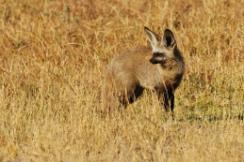 The bat-eared fox (Otocyon megalotis) is a member of the fox family that is found in Angola, South Africa, Zambia, Ethiopia, Sudan and parts of Tanzania. Hunting for bat-eared fox in Africa is normally done in conjunction with a plains game safari. The bat-eared fox lives on insects and uses its large ears to locate its prey. Termites make up 90% of its diet, but it will eat ants, beetles, crickets, grasshoppers, small mammals, and other insects. The bat=eared fox’s food can provide all of its water needs, although the fox will drink regularly if water is available.