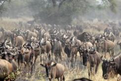Blue wildebeest are most active in the early morning and after the heat of the day has dropped in the late afternoon. Blue wildebeest will gather at night in groups ranging from 10-20 up to thousands. Their major predators are crocodiles, lions, and hyenas. Also, packs of wild dogs can, and do take down the calves, or infirm animals.