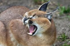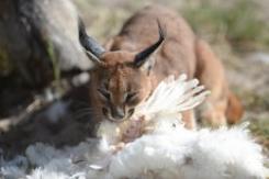 Adult African caracals are solitary by nature, occasionally pairing up as mates. They are nocturnal, hunting birds, reptiles and small to medium sized antelope. They are known for their ability to catch birds by leaping up to six feet into the air from a stationary position. They kill smaller animals with a hard bite to the neck. Larger animals are dispatched not only with the bite to the neck, but also by raking the prey with claws. African caracals usually consume their prey in one meal. They have been known to cover the remains if the carcass is too big. Sometimes they will stash the remains in a tree. African caracals can survive without water for a long time. They get their liquid from the body fluids of their prey.