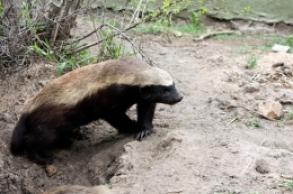The honey badger is also known as the ratel. Pound for pound, the honey badger has the reputation of being the world's fiercest animal, and has been known to show no fear when confronted with predators such as lions, leopards and hyenas. The honey badger gets its name due to its fondness for bee honey. Honey badgers are omnivorous and eat a wide range of food. They are sometimes considered pests, as they will break into chicken coops and wreak havok.