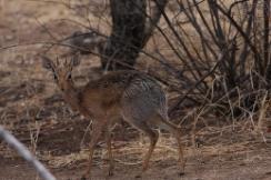 Dik-diks are adapted to dry areas and tend to live in the bush where there is adequate cover. They are browsers and don’t need water to survive. They will drink from puddles or other small sources of water if available. Damara dik-diks are monogamous and if you see one, its mate isn’t far away. It’s possible that their monogamy could be an evolved trait because of the dangers involved in looking for a partner. Female Damara dik-diks gestate for around 170 days before producing one faun. The survival rate for the newborn dik-dik is 50%.