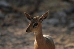 When you hunt Damara dik-dik in Namibia, you need to know that the females are larger than the males when it comes to picking animals to hunt. Males have horns about three inches in length that slant back on their heads. When alarmed, the Damara dik-dik will run in a series of stiff legged bounds. Soft pads on their hooves absorb the shock of impact.