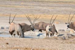 Male gemsbok use their horns for aggressive displays of sideways jabs and straight on fighting. As a result, there isn’t any crowding in a gemsbok herd. Each animal stands exactly one horn’s length from the next. In hot desert habitat, the gemsbok is highly mobile. They will remain in areas where surface water is readily available. When outside temperatures rise, the gemsbok’s internal temperature rises to help throw off heat. Their body can also lower the temperature of the blood going to their brain to be below body temperature.