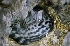 Genets are highly agile animals that possess very good climbing skills, and can stand on their back legs. They can run, walk, trot, jump and climb trees. The male is slightly larger than the female, and is more active at night. Part of this is due to the male’s need for more nourishment because of their size. Genets are solitary animals, only pairing up for mating. The female becomes sexually mature at two years. Gestation is 70-80 days. The female will produce a litter of two to four, twice a year. Males play no part in raising the offspring, leaving all the upbringing to the female. Females prefer to live in thickets, where they can hide their litter, while males stay in the trees.