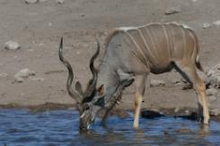Greater kudus tend to be less active during the middle of the day, and look for shade, especially when the temperature is high. They drink and feed on leaves, grass, fresh shoots, roots and fruit during the early morning hours and late in the afternoon. They will water both morning and afternoon. They will stay in one area unless climate conditions or drought cause them to travel. Greater kudu in Namibia have been known to cover very long distances in search of waterholes.