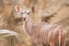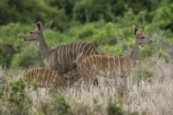 Lesser kudu do not have a breeding season, so calves can be born in any month of the year. Gestation period is eight months; one calf is born. The mother will hide the calf a short distance from her until it is capable of running. The calf is weaned after six months. Females become sexually mature at an age of about fifteen months; males about the same time, however they usually don’t breed until age four or five. During the rutting period, a dominant bull will gather up a small herd of females for breeding. The life span of the lesser kudu is up to fifteen years. When the rut ends, the bull will either join a small group of other bulls, or remain solitary.