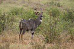 The lesser kudu is mainly active at night and the early morning hours. It seeks shelter in bushes and trees for the balance of the day. The lesser kudu feeds on vegetation from shrubs and shoots, twigs, and foliage from trees. The lesser kudu is not territorial and spends a lot of time wandering in search of food or water. The males aren’t prone to fighting. The adult male lesser kudu prefers to lead a solitary existence, while female lesser kudus are gregarious. The family group consists of mixed sex troops of two to six individuals, although some groups of 25 lesser kudus have been seen. The old lesser kudu bulls tend to stay by themselves.