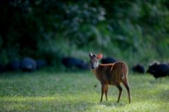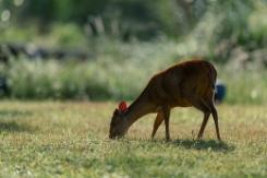 Both male and female Natal red duikers have horns. The male’s horns are twice as long as the female’s. Occasionally the males will fight each other using their horns which can inflict serious wounds. They forage on leaves, fruits, insects, small mammals, and flowers. Often they can be found foraging under fruit trees where monkeys are feeding. Monkeys tend to be a bit sloppy in their eating habits, and this insures that there will be fruit hitting the ground.