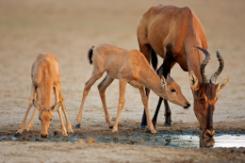 A dominant male will fight to keep its territory and females. The two fighting males will drop to their knees, and head butt each other. They use their horns to force their opponent’s head off to one side, so that they can gore him in his neck and shoulders. This continues until one or the other red hartebeest submits. A dominant male can hold his harem and territory for around six to seven years. Then, a younger, stronger male will drive the old bull away and assume his position.