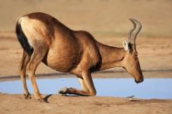 There are few predators hunting red hartebeest in Africa. Lions, leopards, hyenas, and cheetahs will attack them, but the red hartebeest makes up only a small portion of these predator’s diets. Only lions prey on the adult animals, the other predators will kill young calves. The dominant male hartebeest will guard the herd, sometimes by standing on a small hill, or termite mound for better vision. If danger appears, the male will alert the herd by starting off in a run. The rest of the herd then follows him in single file running in a zigzag pattern. They can run at speeds of up to 35 miles per hour for an extended period of time.