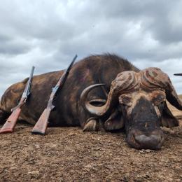 Once fresh tracks are located, the real hunt begins on foot. This can take the entire day, depending on when the buffalo are found. If they have bedded down, you and your PH will hold back and wait for them to start feeding again, which usually happens around midday when swirling winds make a close approach difficult. As the afternoon progresses, the wind becomes more stable, and the buffalo begin moving again, rustling through the brush and creating noise that helps conceal your approach. Carefully closing the distance, you'll assess the bulls, waiting for the right trophy to present a clear shot. Once one does and you and your PH agree on a suitable bull, you’ll set up on a pair of shooting sticks, line up your shot, and then pull the trigger! If you aren’t able to get a good shot on a trophy, you’ll head back to camp and repeat this method the next morning.