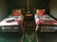 This Tented Camp Hunting Safari is a hybrid consisting of a 4-star tented camp and two permanent chalets that feature permanent electrical power along with cell phone and internet service. The camp is split, with two tents and two permanent luxury chalets. The tented camp features two tents, each with two beds, allowing the tented camp portion to accommodate a maximum of 4 hunters at a time. The tents have nice comfortable beds and have in-suite toilets. The shower facility sits between the two tents and is shared. Each permanent chalet can sleep 3 people.